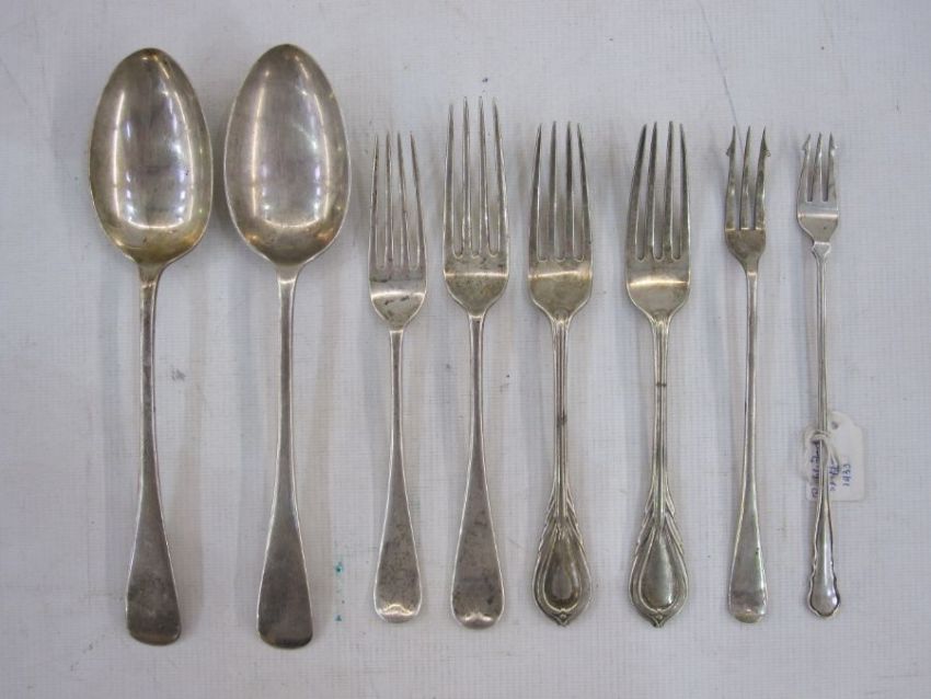 Pair of silver  tablespoons, two silver  forks, a silver pickle fork, Sheffield 1933 and two plated dinner forks and a pickle fork, silver content 9oz