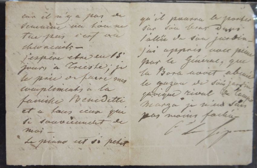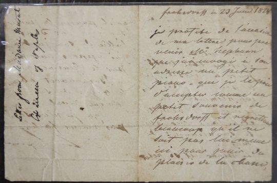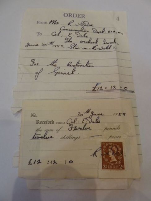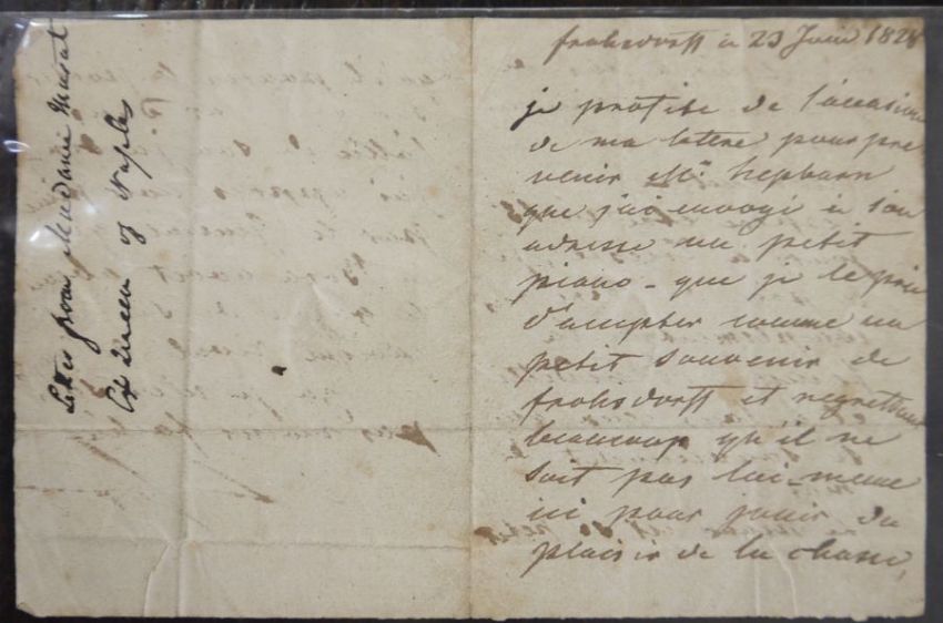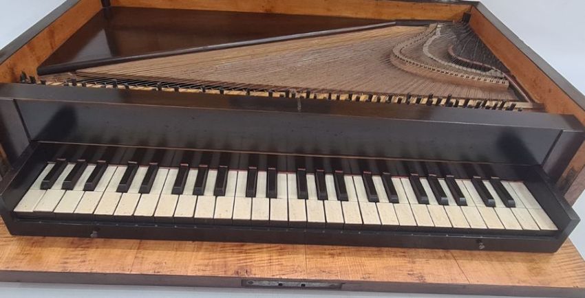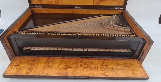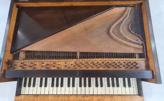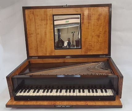 19th century figured wood and satinwood travelling miniature piano/spinet given by Caroline Murat, Queen of Naples, to George Hepburn and by descent to the current family owners, with original handwritten letter from Caroline, the piano with lift-up lid and folding fall front with satinwood lined interior, pair brass carrying handles to the sides, the lid interior with mirrored panel and having removable dark stained wood and fabric dust cover, with knob handle, the keyboard sliding, 68cm x 39.5cm Caroline Bonaparte later Murat, Queen of Naples (1782-1839) married Joachim Murat, a general on Napoleon's staff.  She was politically ambitious and wielded significant power.  Napoleon made the Murats King and Queen of Naples in 1808.  After Joachim was executed she was kept under the dominance of the Austrians first at Hainburg and then Frohrsdorf Castle, styling herself as a Countess of Lipona (anagram of Napoli) before settling in Trieste in 1824.  She went back to Frohrsdorf for a visit in 1828 from where she wrote the letter in June, gifting the spinet to George Hepburn.  The spinet has passed through various generations via George Hepburn's niece, Margaret Hepburn, wife to Sir David Deas, KCB, Inspector of Hospitals and Fleets in the Royal Navy.  Family legend has it that George was one of Caroline Murat's lovers in Trieste.  The item is sold with original handwritten letter, which translates  ‘I am taking the opportunity of my letter to advise Monsieur Hepburn that I have sent to his address a little piano which I beg him to accept as a small souvenir from Frohrsdorf and regretting greatly that he is not here himself to take pleasure in the hunting, because there is not a week goes by that we don’t bag a stag or fawns.  I hope to be Trieste in a fortnight’s time, please pay my respects to the Benedetti family and to all those who remember me.  The piano is so small that he could carry it in his arms down the garden path.  I am sorry to hear from the general that the Bora wind has damaged the lawn in his garden, and even though it rivals the Campo Marzo, I am no less angry. Comptesse de Lipona’ and with various black and white photographs showing the spinet in an old family residence and restoration receipt dated 1959. Condition ReportPLease see new image of the receipt dated 1959 for restoration. The piece does need attention