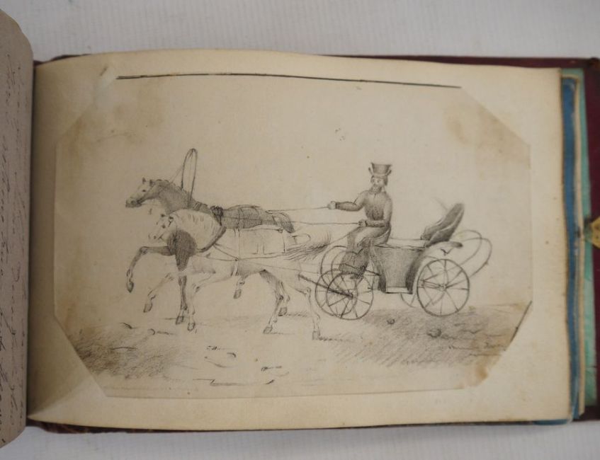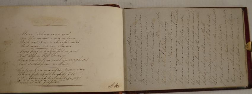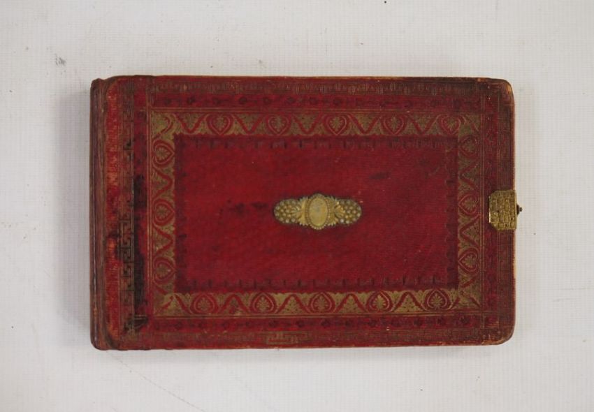 Mid 19th century scrap / sketch book with poems, watercolours, drawings, prints, etc, earliest date 25th December 1824, 1825, 1830, within a leather binding with brass clasp and brass escutcheon in centre front board, blindstamped with gilt decorations, appears to have been rebacked with the contemporary leather laid down