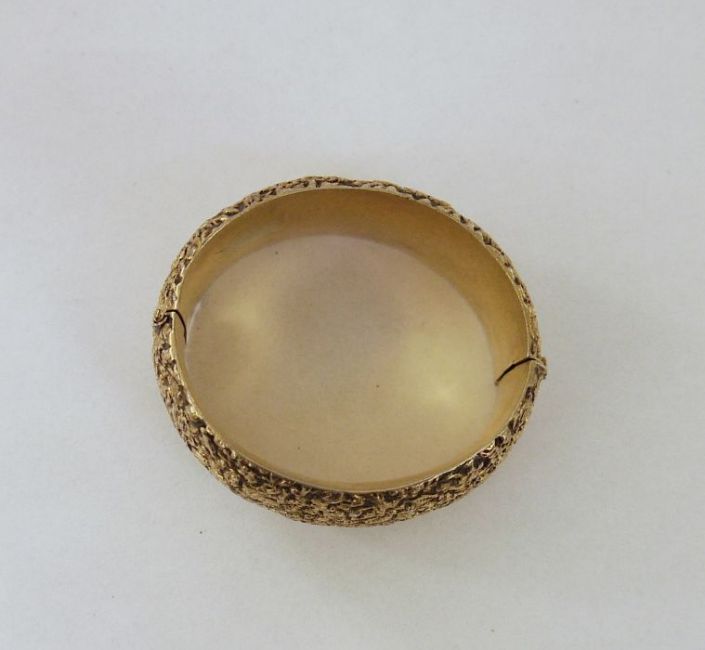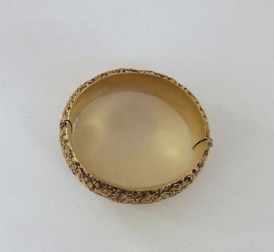 Gilt-metal wide bangle, allover foliate scroll relief decorated Condition Report272 grms weightApprox 15cm inside circumference, 6cm long x 5cm wide