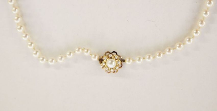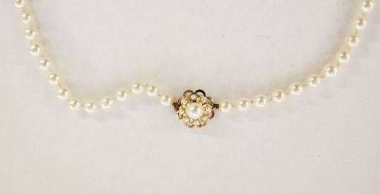 Single row of graduated cultured pearls with pearl set gold clasp marked K14, approx. 69cm long