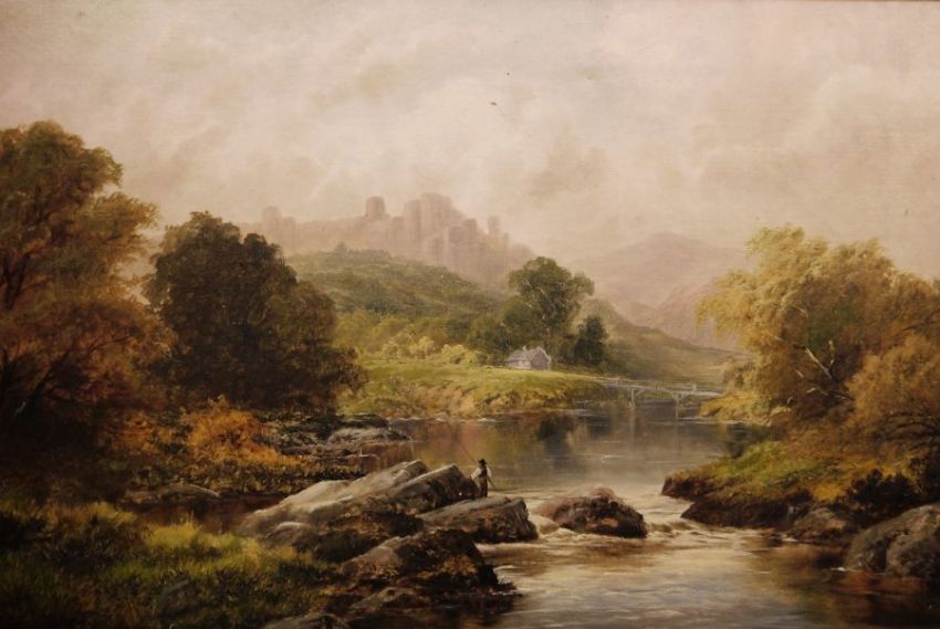 UnattributedOil on canvas"Chepstow Castle on the Wye, Monmouthshire", mountainous river scene with castle in background on the hill and fishermen to foreground on rocks, labelled verso, 49cm x 73cm Condition ReportAppears in overall good condition; two tiny areas of loss of paint (centre of sky area), no visible marks or build up of surface dirt, possible fading of colour