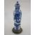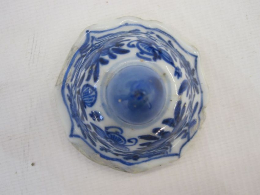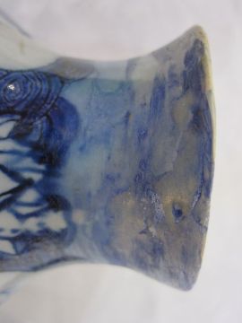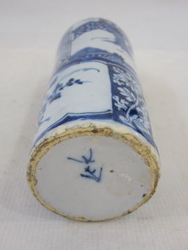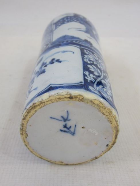 Chinese-style delft slender shouldered and tapering vase with panels of ladies in garden, in underglaze blue and a matched domed cover, 30cm high (restoration throughout) Condition ReportPlease see additional imagesWear to base of vase with some chipped areas, chips to outer rim of mouth of vase, cover also chipped to outer rim, signs of repair/restoration to both