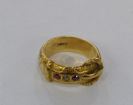 18ct gold, ruby and diamond buckle ring, set two small rubies and one diamond, with scroll engraved borders, 8.5g