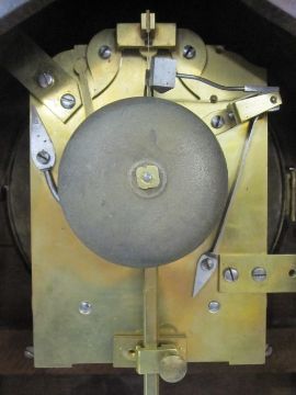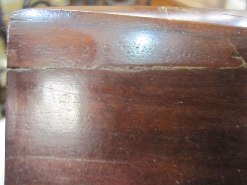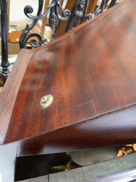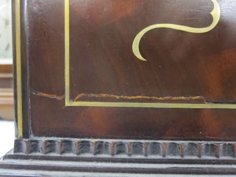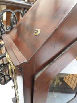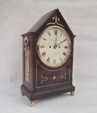 Circa 1800 bracket clock by Robert Roskell & Son, the mahogany triangular top with moulded edge, with central brass inlay, the stepped base raised on brass ball feet, the enamel dial marked 'Robt. Roskell & Son, Liverpool', with Roman numerals, the sides with brass ring handles, the mechanism marked 'Robt Roskell & Son, Liverpool', with chiming mechanism, 48cm high Condition ReportPlease see additional imagesThe case has some slight repairs, scratches to the pediment, some splits to veneer at the front, small piece of wood missing from bottom corner of door, some small scratches to glassThe movement is not visible - if you would like further information in this respect, please call us on 01242 256363please image of the screw, added