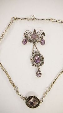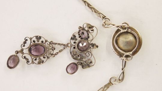 White metal, amethyst and seedpearl pendant, the amethyst set within a scrolling wirework frame, 7.5cm long (with losses) and a white metal necklace with paste set circular central pendant (2)