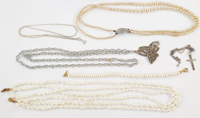 Triple string of freshwater pearls, various strings of faux pearls, a diamante necklace, watches and other items