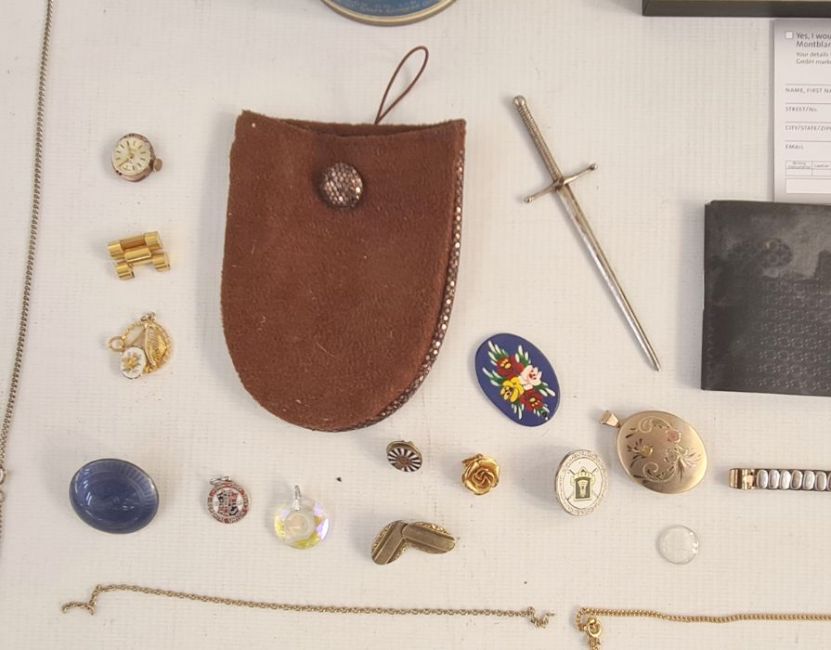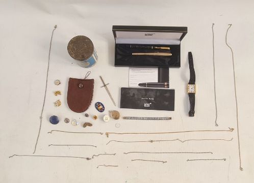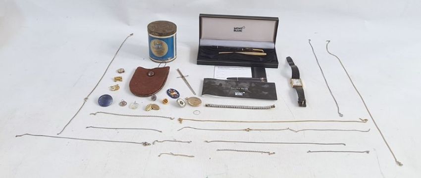 Mont Blanc box (no pen), a Parker pen with faux-tortoiseshell, a gold-plated Parker pen, a small tin of shells, a little purse, a watch marked Seiko and other bits and pieces (1 box)
