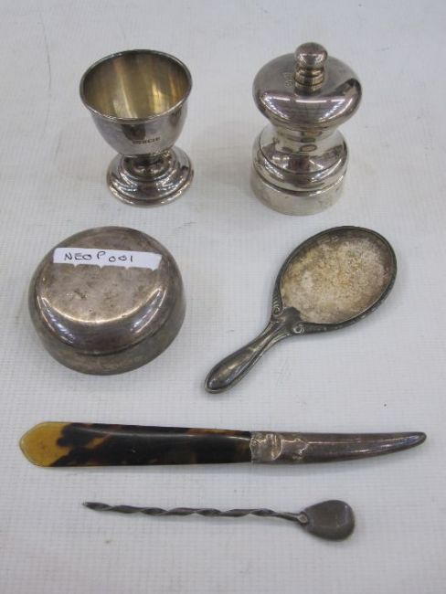 Silver pepper mill, a silver eggcup, a silver-handled tortoiseshell paper knife and sundries