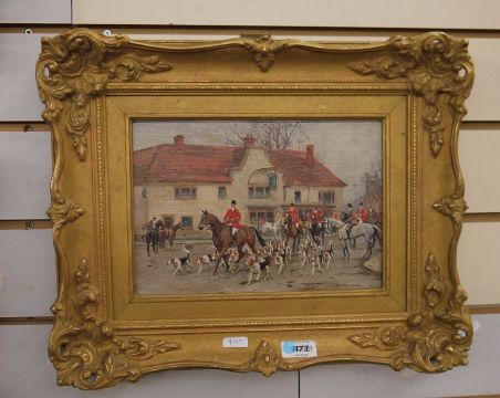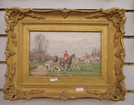 John Sanderson Wells (1872-1955)Pair oils on boardHunting scenes, Huntsmen and hounds on village green, signed lower left, 16cm x 25cm and 17cm x 25cm together withJohn Sanderson Wells (1872-1955)Set of three oils on boardHunting scenes, Huntsmen and hounds on a lane, in front of Public House and going through a country gate, each 16.5cm x 25cm (5) Condition Report.