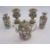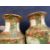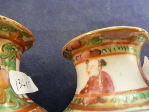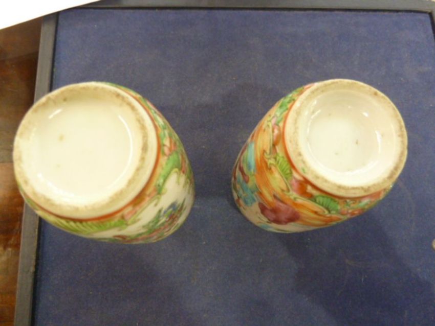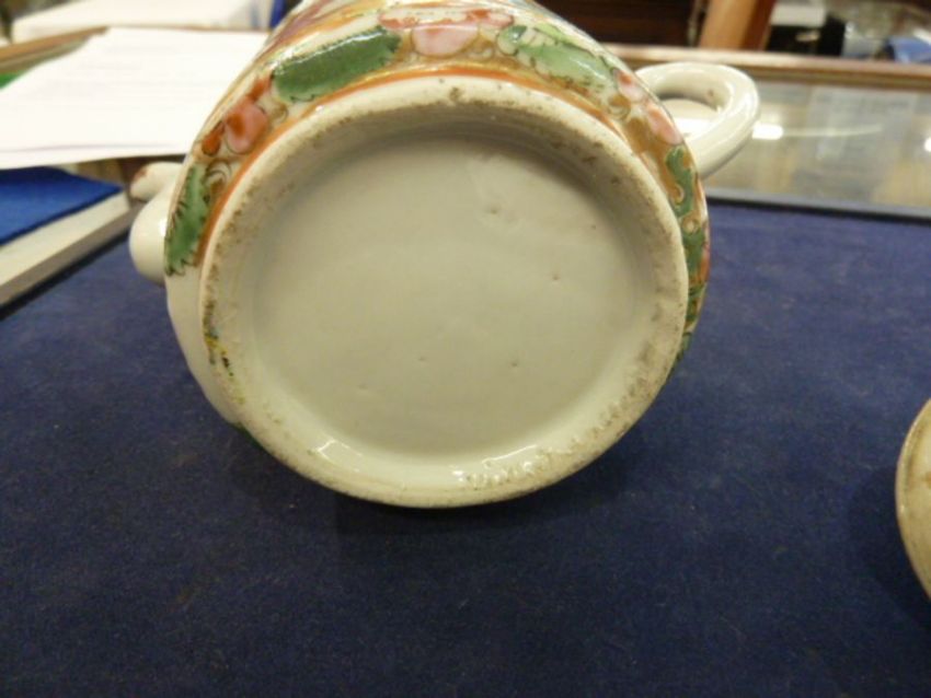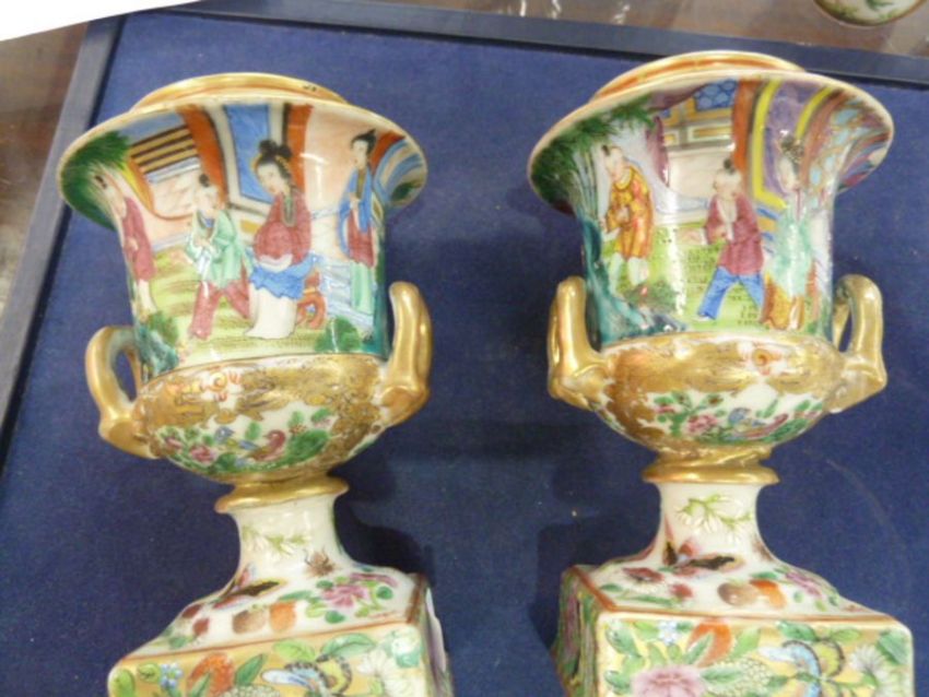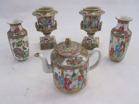 Chinese canton porcelain small teapot decorated in famille rose colours, 13cm high, a pair of vases,  ovoid, 12.5cm high and a pair of similar two-handled urns of campana-shape, each on square plinth base, 14cm high (5) Condition Reportplease further images - one of the small vases may have had restoration on a rim. Please check images