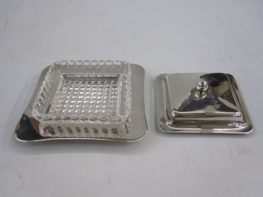 George V silver butter dish of square form and having glass bowl, Sheffield, John Round and Son ltd, 1923