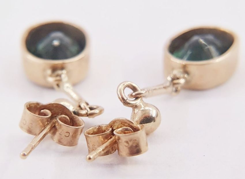 Pair gold-coloured metal and green tourmaline pendant drop earrings set oval stones