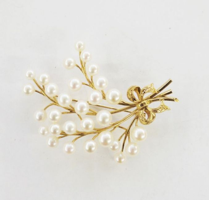 Gold and cultured pearl spray brooch with bow detail, marked 14K, 7cm long