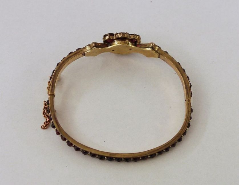 Gold-coloured metal and garnet set bangle having flowerhead to the top with small garnets, claw set Condition ReportBracelet is oval; inside measurement 53mm x 42mmSome stones are worn and some have small chips as expected with age, more to the back