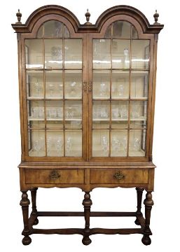 William & Mary-style reproduction china cabinet, the upper section with twin round arch top and three turned finials, pair astragal-glazed panel doors enclosing three shelves, the base with two short drawers and on inverse cup and tapering supports, shaped stretchers and on bun feet, 125cm wide