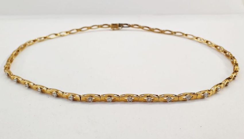 18K gold and diamond necklace set 28 small stones, each on individual openwork link, gross weight 19.5g approx.