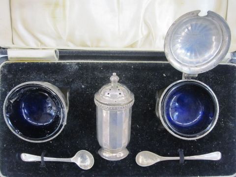 Three-piece silver condiment set, cased, two silver  salt spoons and a plated set of six shell bow coffee spoons