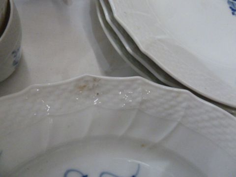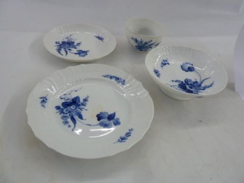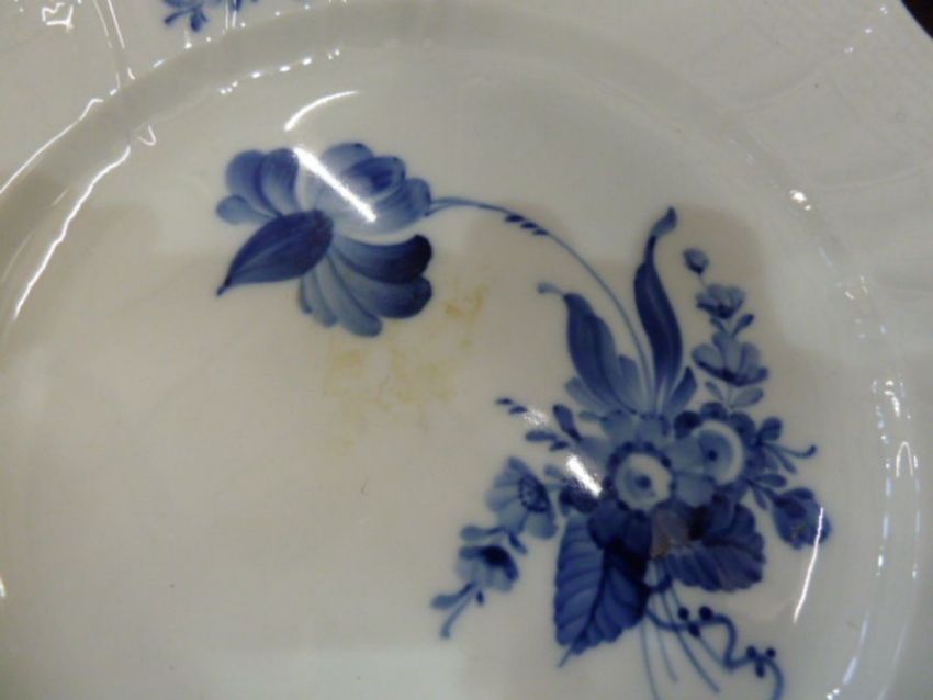 Royal Copenhagen blue flower part dinner service, mainly for six, to include small and medium plates, tea and coffee pots, cream jug, sugar basin, leaf dish, soup cups and saucers and other items.Condition Reportin general condition fair and no apparent damage or restoration. Some of the dinner plates have stains, see images. Each image is of a different plate. The dinner plates measure 22 cms , 8 in total, the tea/side plates 18csm - 8 in total, 6 small bowls 14.5 cms, 6 soup bowls and saucers, 4 teacups and three saucers9 coffee cups and 9 saucersPlease do ring for more detail  01242 256363