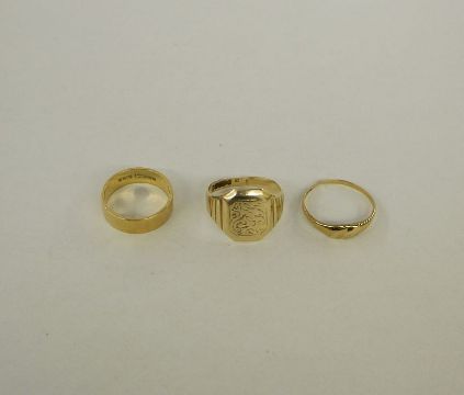 9ct gold signet ring, engraved, an 18ct gold wedding band and a 9ct gold twist ring (3) Condition ReportApprox 9.7g