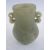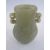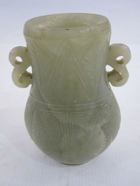 Chinese carved jade baluster vase of flattened form, having pair S-scroll handles and the body carved with stylised leaves, 11cm high
