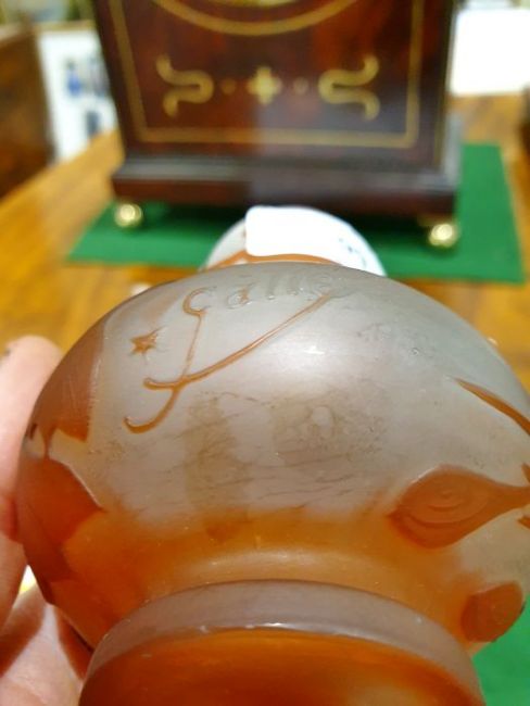 Emile Galle Art Nouveau cameo glass vase, moulded signature beside star mark, of baluster form decorated with sprays of trumpet-shaped flowers in orange on a frosted ground, 9.5cm high Condition ReportMinor wear throughout including some scratches to the base, some surfaces scratches and marks, see pictures.