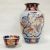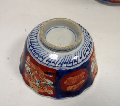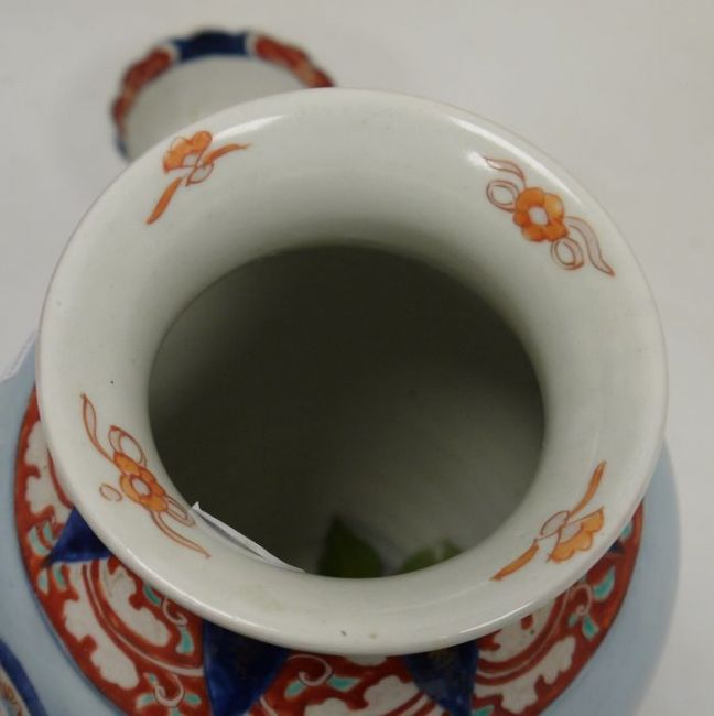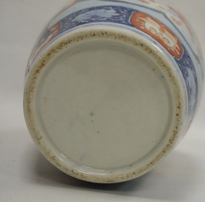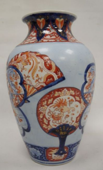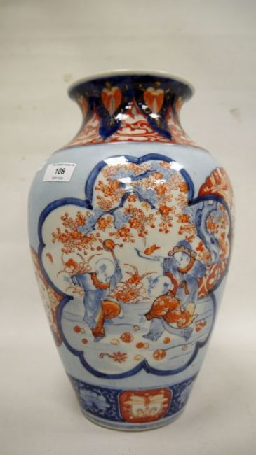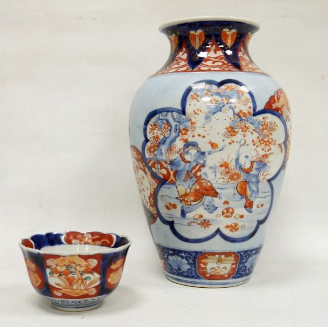 Asian porcelain tapering oviform vase and an Imari pattern fluted bowl, late 19th/20th century, the vase painted in underglaze blue and overglaze lime, red, turquoise and gilding with figures before terracing and fan-shaped cartouches of fantastic beasts, 34cm high, the bowl painted with chinoiserie shrubs, 12cm high (2)
