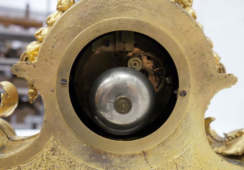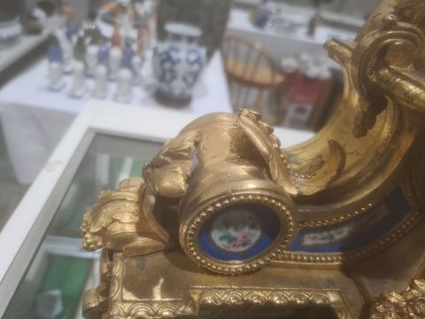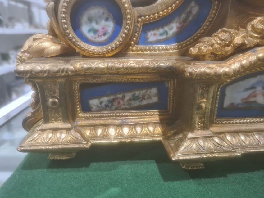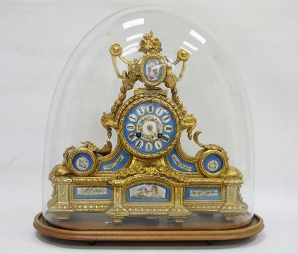 French gilt metal and porcelain mantel clock, the porcelain dial with Roman numerals, the movement marked 'Japy' and all under glass dome Condition ReportThe clock does have a pendulumApprox. Height 42cmClock - a couple of the porcelain tiles are loose. The top section is loose. one of the floral decoration on the side is broken and part is loose. The front floral decoration is loose. There are several spots where the gilt is loose.Dome - Wear/ imperfection to lower rim. Bubble in glass and line approx. 30cm diagonal See attached images