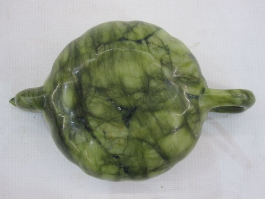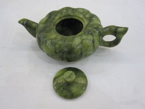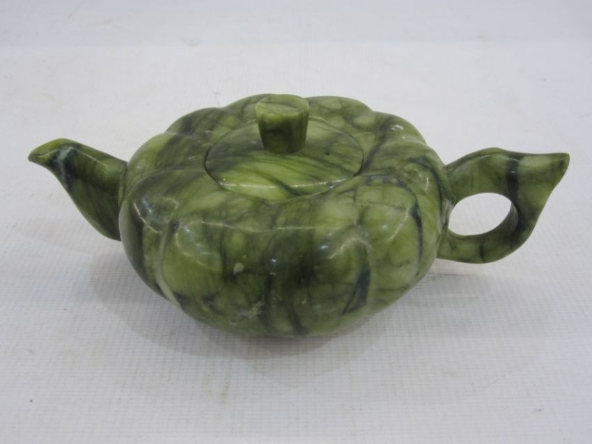 Chinese variegated jade teapot of pumpkin form, 17cm over the handle