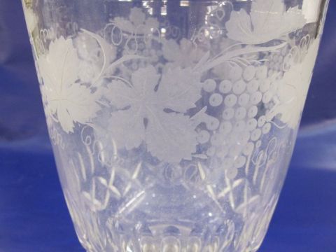 Antique cut and etched glass celery vase, the rounded body with etched fruiting vine, ovolo and cross cutting, on panelled waisted column, circular foot, 28cm high