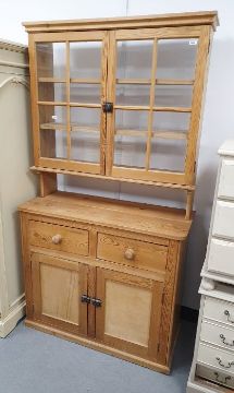 Pine glazed dresser with glazed cabinet top, cupboards bellow on plinth base (106x44x199cm)
