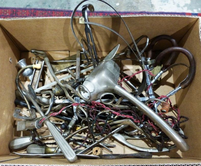 Large quantity of metal surgical instruments in one box