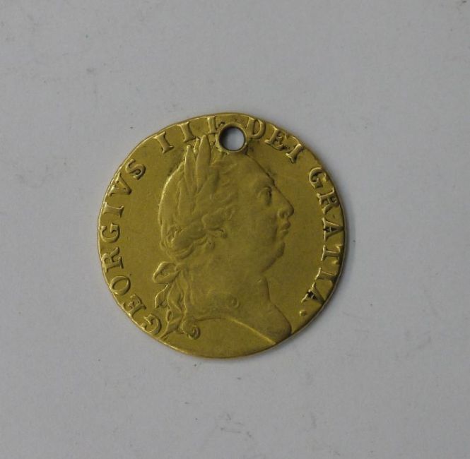 George III (1760-1820), gold Guinea, 1789, fifth laureate head right, GEORGIVS III DEI GRATIA., Reverse. spade shaped crowned quartered shield of arms, date below. Pierced s3729