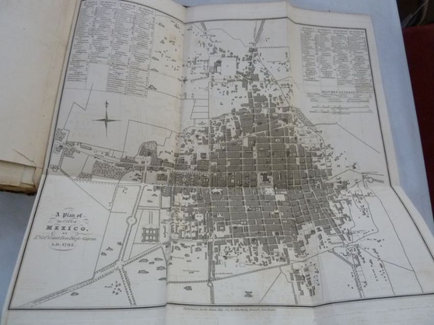 Bullock W. "Six Months' Residence and Travels in Mexico containing remarks on the Present State of New Spain...." John Murray 1824 , engraved folding frontis , View of the City and Valley of Mexico from Tacubaya, pages 3-14 including two plates are separating, two folding plates bound at the back of the book to include Ancient Mexico and plan of the City of Mexico by Lieutenant Colonel Count Don Diego Garcia AD1793, plates, and one coloured plate 'Mexican Gentleman', slight foxing throughout, hinges cracked, rebound plain boards with paper pastedown to backstrip (not collated)