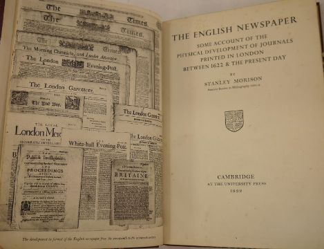 Copies of the Cheltenham Chronicle dated 1912 to include an obituary for a Gloucestershire Citizen who died on the TitanicMorison, Stanley"The English Newspaper ...", Cambridge 1932, rebound, half-morocco over marbled boards with raised bands, gilt titles"Beautiful Britain ...", The Werner Company of Chicago 1894, photographic plates, half-leather, gilt titles "Around the World Portfolio of Photographs", published Georges Newnes Limited 1895, oblong folio (4)