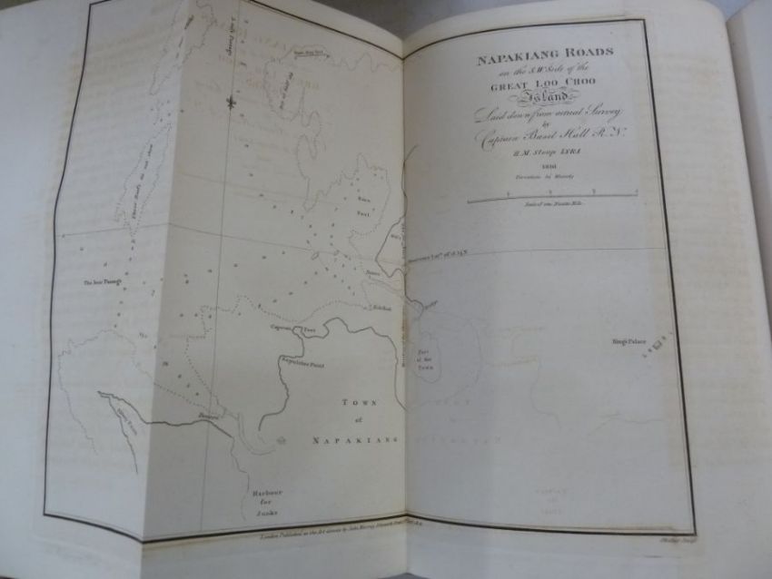 Hall, Captain Basil"Account of a Voyage of Discovery to the West Coast of Corea and the Great Loo-Choo Island ... and a Vocabulary of the Loo-Choo Language by H J Clifford Esq", John Murray 1818, engraved coloured frontis, coloured plates with tissue guards, the guards are foxed, all maps present in the appendix, half-leather over marbled boards, red pastedown with gilt title to backstrip but part missing, some foxing and offsetting from the plates and maps, pencil inscription inside ffep saying 'Sotheby 12/12/46 £2.10' and '31/7/47 £2.15'