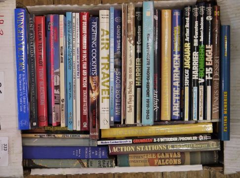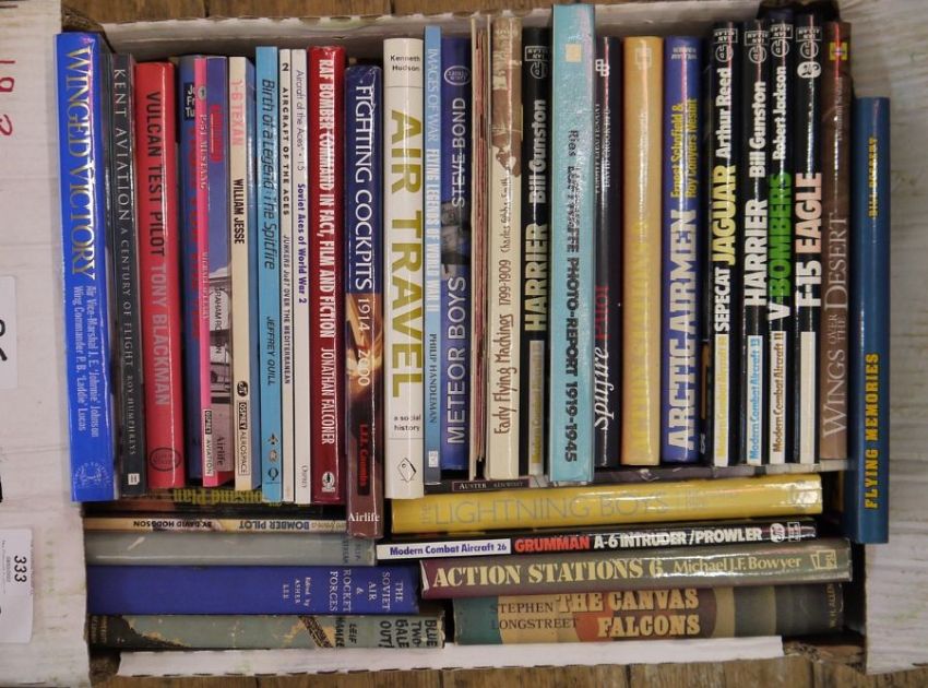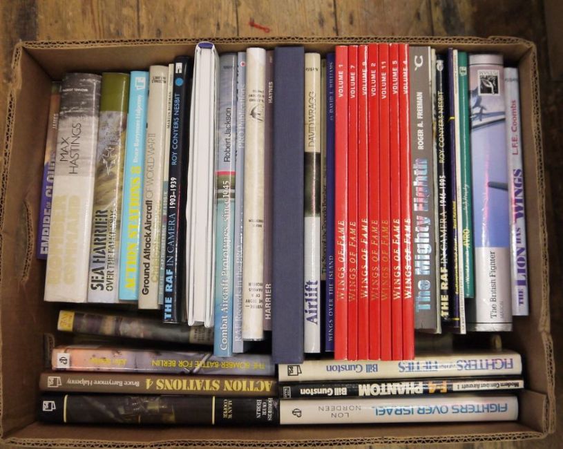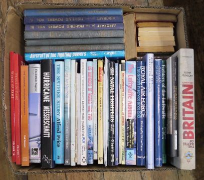 Aviation to include "Aircraft of the Fighting Powers", 7 vols, one with djPrice, Alfred "The Spitfire Story""The Luftwaffe Album", "US Bombers of WWII", "Wings of Fame", 6 vols, "Spitfire - The Story of a Famous Fighter", Air Travel, "Fighters of Israel", "Bombers Over Berlin", "Action Stations" and various other volumes (3 boxes)