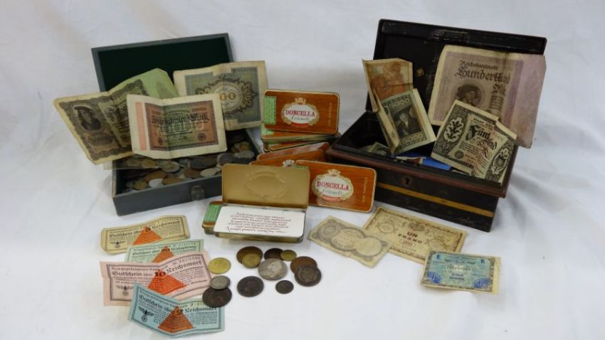 Large quantity of English coins and some foreign to include George III 1797 1/4 sovereign (poor) early silver milled coins (varied state) some pre 20 / pre 47 silver,  Pennies and half pennies some German bank notes, pre Reich and WW2