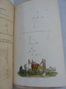 "Nattes's Practical Geometry or an Introduction to Perspective - translated from the French of Le Clerc", published as the act directs for J C Nattes by W Miller, Albemarle Street 1805, coloured vignettes etched from designs related to the different geometrical figures by W H Pyne, the problems engraved by T King, coloured engraved frontis of a view of a mill by the bridge at Bray, near Dublin, contemporary binding but the backstrip replaced with tape, contemporary pastedown on backstrip but with loss, boards very bumped, hinges cracked and free ep missing and a possible half-title, initial pages from the tp to page 10 are loose, 4 books in 1, tp for 'The Second Book of the Construction of Plane Figures' page is loose (this has not been collated but appears to be complete, please check before bidding)