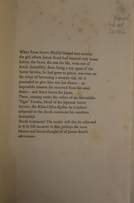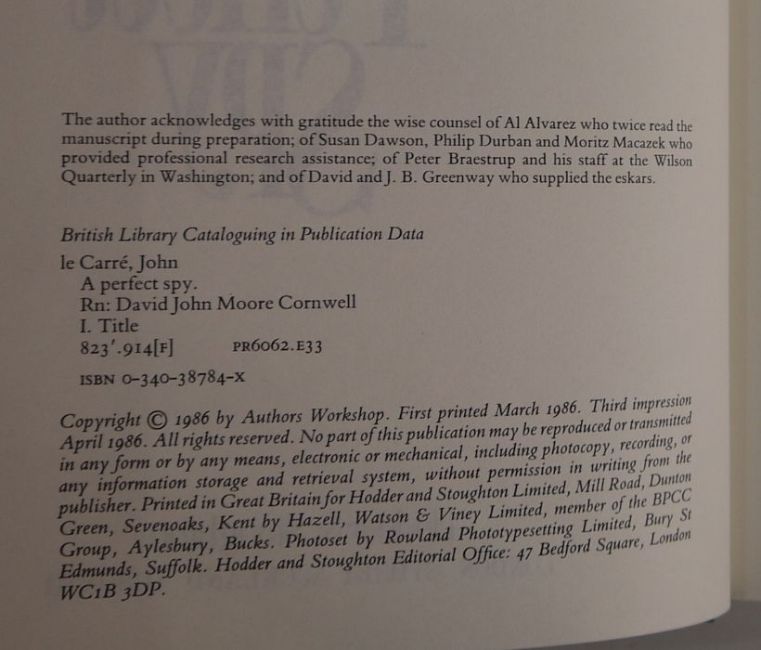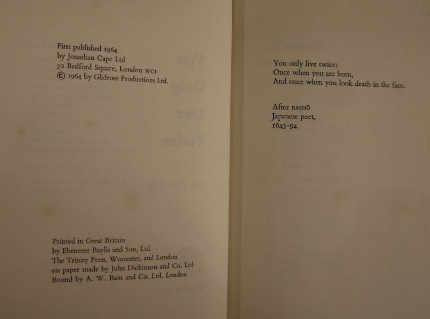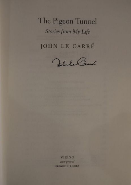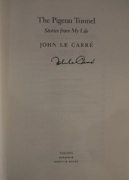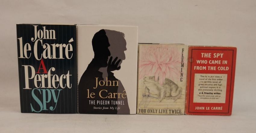 Fleming, Ian"You Only Live Twice", Jonathan Cape 1964, Japanese characters to black cloth and silver titles to the backstrip, dj price clippedLe Carre, John"The Spy who came in from the Cold", Victor Gollancz Limited 1964, 6th impression January 1964 (1st edition 1963), blue cloth, some fading to the base of the boards, foxing to dj and a small loss and tears to top and bottom of djLe Carre, John"The Pigeon Tunnel, Stories from my Life", Viking, Random House, published 2016, signed by the author on tp, black cloth with gilt titles to the backstrip, dj not price clippedLe Carre, John"A Perfect Spy", Hodder & Stoughton 1986, 3rd impression April 1986, red ep, blue cloth, dj not price clipped (4)