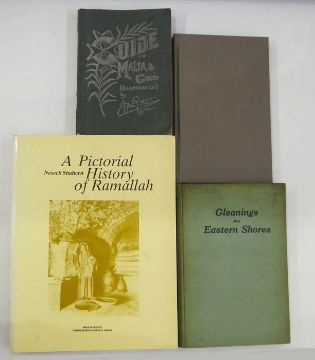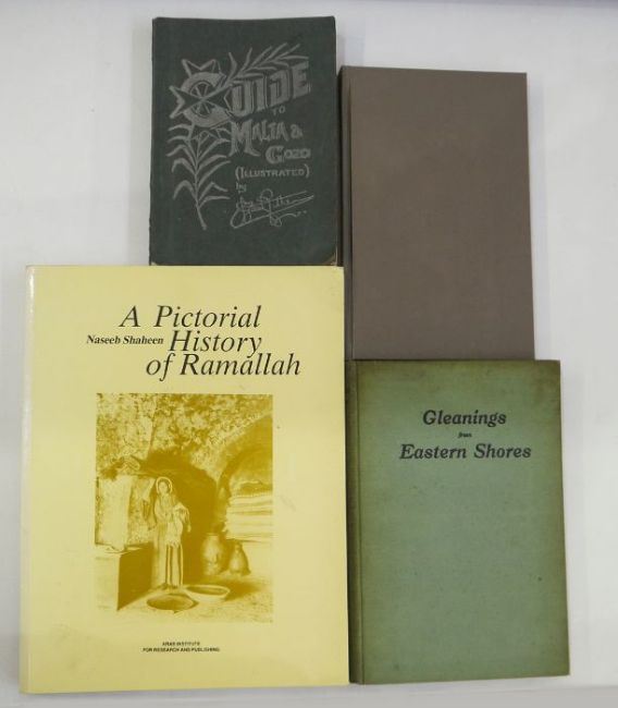 Shaheen, Naseeb "A Pictorial History of Ramallah", the Arab Institute for Research and Publishing (1993), inscribed and signed by the author on the half-title, photographic illustrations throughout, yellow limp covers with photographic image"Gleanings from Eastern Shores, a collection of articles about Japan and things Japanese", reprinted from Sunday editions of the Japan Times, published by the Japan Times in Tokyo, n.d., Japanese characters stamped on ffep, green cloth and black titlesHume, The Rev A "Illustrations of British Antiquities Derived from Objects found in South America", Liverpool T Brakell 1869, illustrations throughout, rebound in grey cloth Rutter, Joseph Gatt"Illustrated Guide to Malta and Gozo", printed and published by the Colonial Library Valetta, frontis portrait of H E General Sir Henry McLeod Lesley Rundle, numerous photographic illustrations, limp covers (4)