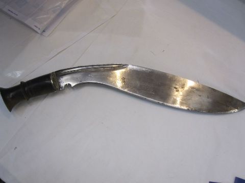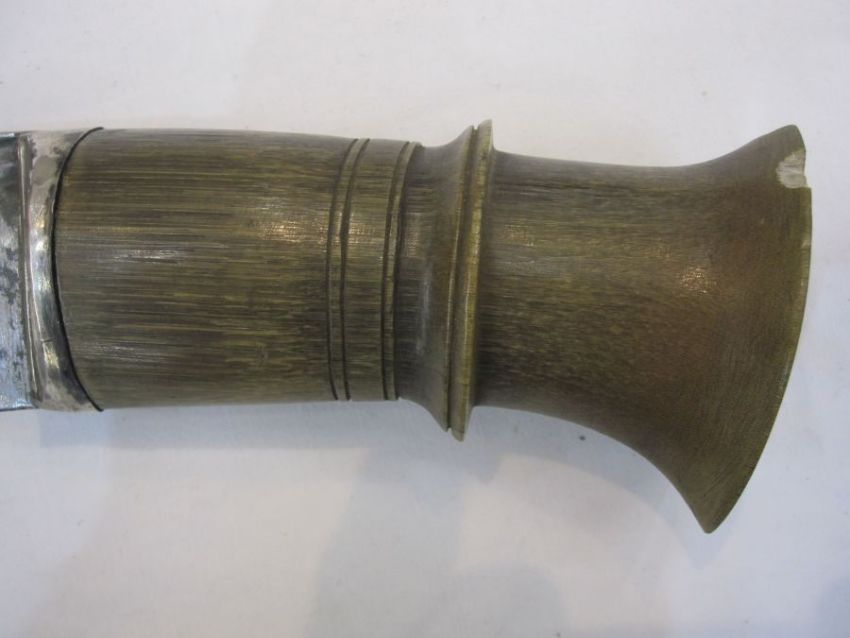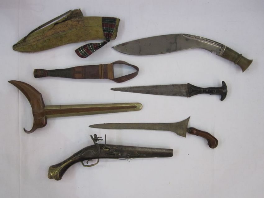 South East Asian kris with iron blade and wooden scabbard and kukri knife, Indian dagger and decorative flintlock pistol Condition ReportPlease see additional imagesThe kukri knife shows signs of use, damage to pommel, scabbard damaged/split, blade approx 36cm, total length approx 46cmKris knife blade approx 32cm, total length approx 42.5cm