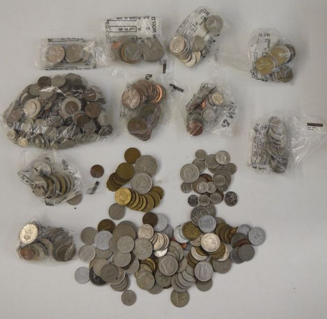 Large group of foreign coins, Swiss, Dutch, Irish and others (1 box)