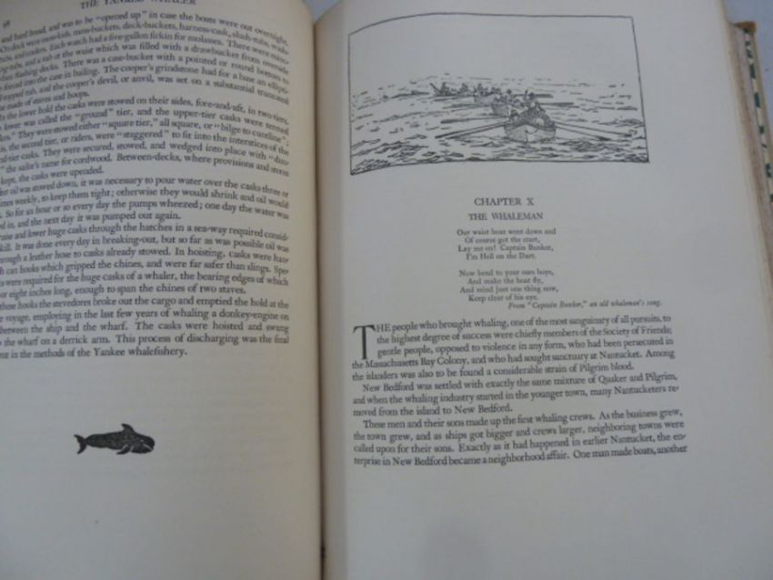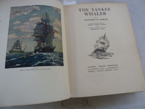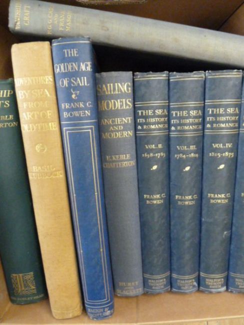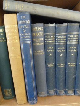 Maritime and Naval interest to include:-Chatterton, E Keeble"Sailing Models, Ancient and Modern", Hurst & Blackett Limited 1934, colour frontis, photographic and other plates, some foxing, blue cloth with gilt titles, small folio "Old Ship Prints - with illustrations from the Macpherson Collection", John Lane, The Bodley Head 1927, colour frontis, numerous black and white and colour plates, green cloth, gilt titles, cloth has received some damage, folioCarr, Frank G G "Vanishing Craft, British Coastal Types in the Last Days of Sail", illustrated by Frank Mason RI, Country Life Limited 1934, frontis, blue cloth, gilt title, folioLubbock, Basil"Adventures by Sea from Art of Old Time", preface by John Masefield, edited by Geoffrey Holme, published by The Studio Ltd 1925, this edition limited to 1750 copies, this is number 1440, colour plates with tissue guards, other plates, purple cloth with gilt titles, backstrip sunnedBowen, Frank C "The Golden Age of Sail, Indiamen, Packets and Clipper Ships", illustrations from the Macpherson Collection, London, Halton & Truscott Smith Ltd 1925, colour frontis tipped in, colour plates tipped in, some foxing, blue cloth with gilt titles and decoration, folio"The Sea its History and Romance", in 4 vols, Halton & Truscott Smith, colour frontis to vols, colour and other plates, blue textured cloth, gilt rules, titles, etc Mahan"The Life of Nelson, the Embodiment of the Sea Power of Great Britain", in two vols, Sampson Low, condition poor Ashley, Clifford W "The Yankee Whaler", Martin Hopkinson & Company, The Riverside Press, Cambridge, Massachusetts, printed in the USA, woodcut vignette on tp, colour frontis, colour plates, woodcut illustrations, pictorial ep, front hinge cracked and loss to the ep at the hinge, quarter cloth with gilt titles and decorations, boards with black titles and the corners rather bruised