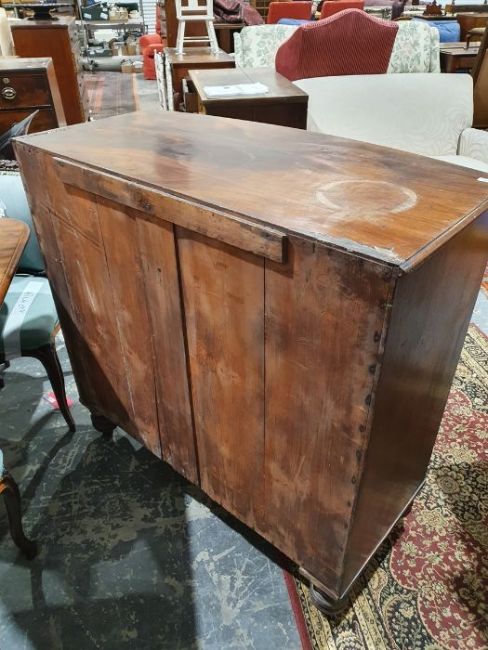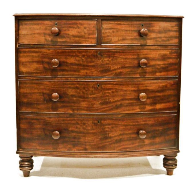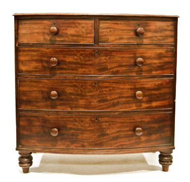 Victorian bowfront mahogany chest of two short over three long drawers, on turned supports, 106cm x 104cm Condition ReportSurface scratches, scuffs and knocks to the wood. Areas of fading and discolouration, some staining. Areas of loss to the beading and veneer, some splits.
