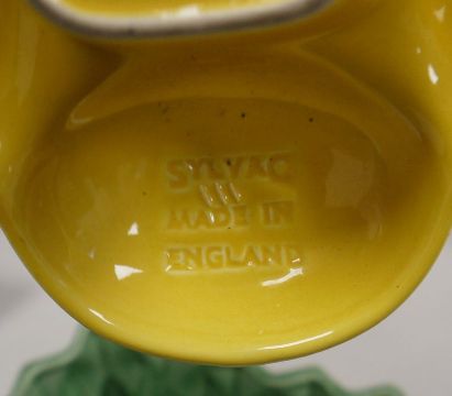 Collection of Sylvac La Ronde pattern wares and other items, mid century and later, impressed marks, including a pair of red and white striped conical salt and pepper shakers, a vase, a flared cylindrical vase (13cm high), a honeypot and cover, a black and white striped wall pocket, a green and white striped basket, a yellow petal-shaped stand, an Art Deco style diamond-shaped teapot moulded with diamonds in high relief, unmarked, and other items