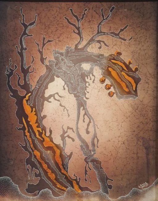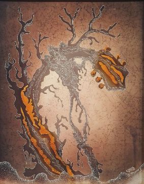 20th century Australian schoolPainting on fabricSkeleton arm holding neck of guitar, indistinctly signed lower right, 87cm x 69cmCondition Reportphotos added