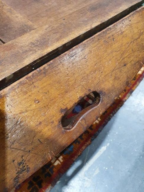 19th century mahogany butler's tray on folding stand Condition ReportSurface scratches, scuffs, accretions, stains and knocks to the wood. Areas of fading and discolouration. Split to the centre of the tray.Height 51cm