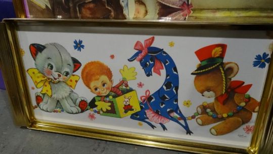 Vintage child's toys and pictures to include Mazda Disney lights, Walt Disney Winnie the Pooh game, toadstool money box, Birmingham municipal bank money box, mother goose mobile, Flowerpot men book, further childrens books, Anna Kermer childrens print, Riche tray, vintage puzzles, 1951 Sacul Waggly duck family, Cinderella peep show book illustrated by Roland Pym, two Molly B Thomson Kiddie Kut books, two 1950's Bancroft pop up books, Leonard Wiesgard Mother Goose nursery prints, John Hassall 1927 Hey Diddle Diddle book, Bill and Ben book with illustrations by Janet and Anne Grahame Johnstone, Manni the donkey Disney tray and vinyl Disney bag, antique Hey Diddle Diddle and Red Riding Hood double sided puzzles etc (3 boxes)