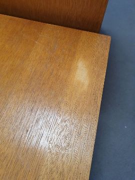 Mid-century modern Meredew oak dressing table / desk with drawers and cupboard door, on tapering supportsCondition ReportSurface scratches and scuffs to the wood, some areas of fading and discolouration, some staining.  Areas of loss to the veneer on the front of the drawers.Height 71cmWidth 122cmDepth 51cmRecess measurements:Height 67cmWidth 41cm